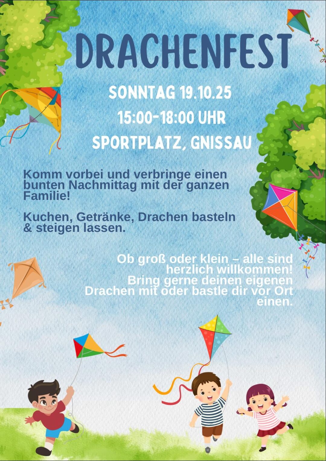 Das Drachenfest findet am 19.08.2025 von 15 – 18 Uhr auf dem Sportplatz des TSV Gnissau (Ottenbergkamp 17) statt.